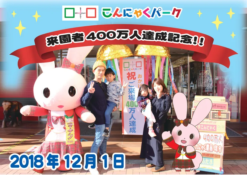 日本の伝統食“こんにゃく”を楽しく体感する施設「こんにゃくパーク」(支配人:猪谷 清吾、運営:株式会社ヨコオデイリーフーズ)は、2018年12月1日(土)にこんにゃくパークの前身であるこんにゃく博物館からの累計来園者数が400万人を達成し、「400万人ありがとう」セレモニーを開催いたしました。