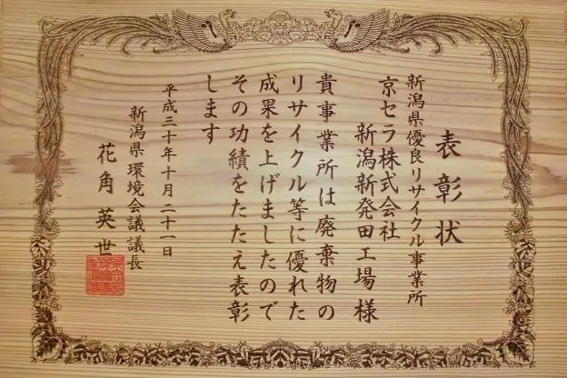 京セラ株式会社の新潟新発田工場が、新潟県より事業者の廃棄物の発生抑制、再使用及び再資源化に関する意識の高揚を図り、循環型社会の形成の促進を図るため、リサイクル等に積極的に取り組み、優れた効果を上げた県内の事業所を表彰する「新潟県優良リサイクル事業所表彰」を受賞しましたので、お知らせします。