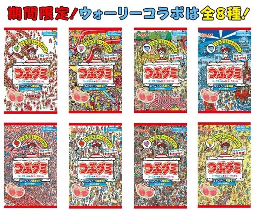 春日井製菓株式会社(本社:愛知県名古屋市/代表取締役:春日井康仁/以下 春日井製菓)は、2018年12月3日(月)から全国のコンビニ・スーパーで、株式会社スタイリングライフ・ホールディングス プラザスタイル カンパニーがマスターライセンスを保有するプロパティ「WHERE’S WALLY?(ウォーリーをさがせ!)」とコラボレーションした「つぶグミ ウォーリー ヨーグルト味&苺ヨーグルト味」を新発売いたします。パッケージ上では、つぶグミのキャラクター「つぶグミちゃん」をさがすことができ、味もこの商品限定の「ヨーグルト味」「苺ヨーグルト味」になっています。