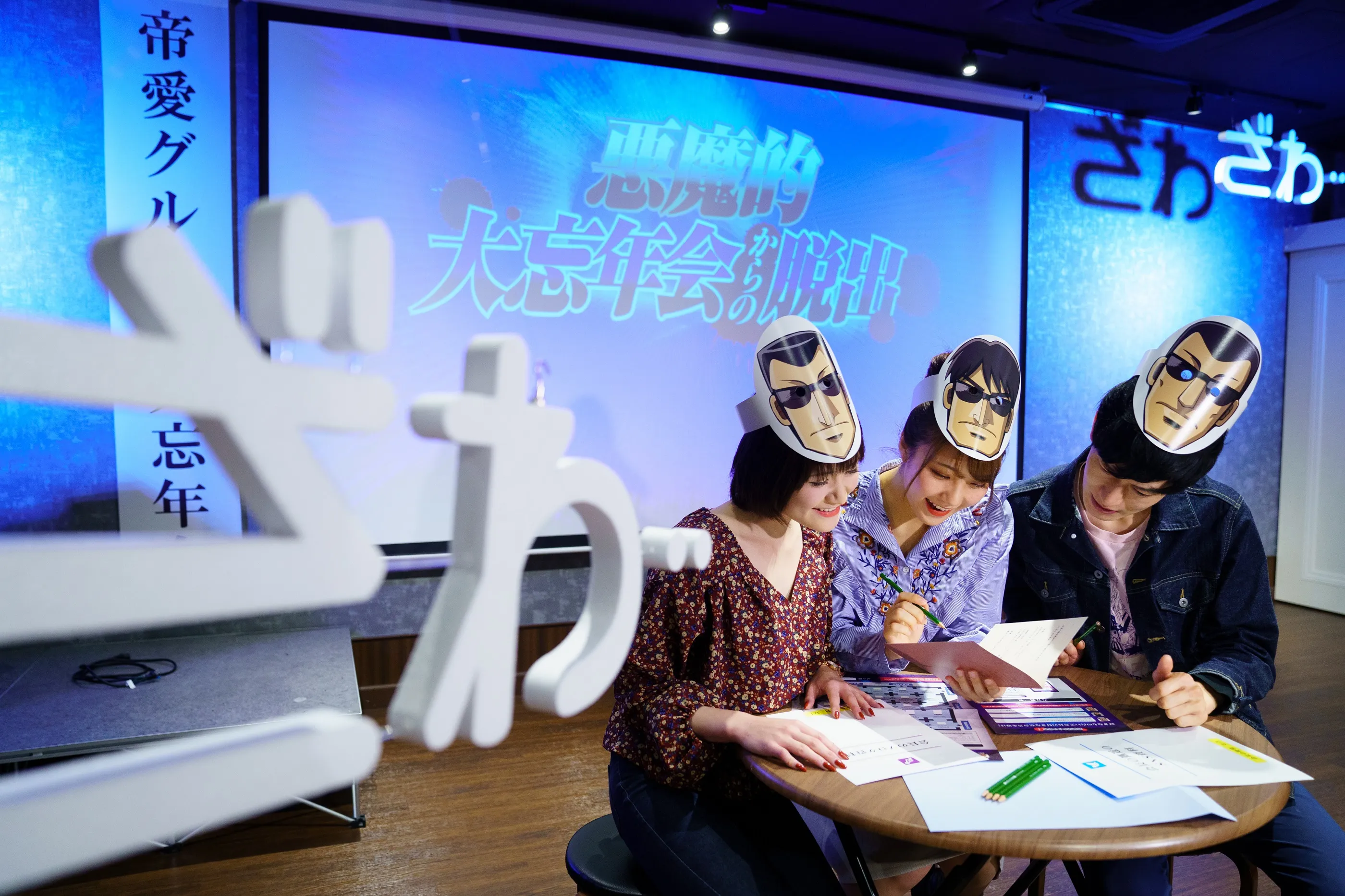 本作はあの「賭博目次録カイジ」のスピンオフ作品で、現在アニメが放送中の「中間管理録トネガワ」とコラボレーションした前代未聞のリアル脱出ゲームです。プレイヤーは帝愛グループの社員であるの黒服の一員となって、チームトネガワに課せられた「圧倒的宴会芸でグループ会長である兵藤会長を楽しませる」という使命を乗り越えてゲームクリアを目指します。謎を解いて出てくるのは、部屋から出る鍵や事件解決の手がかりではなく、なんと宴会芸!