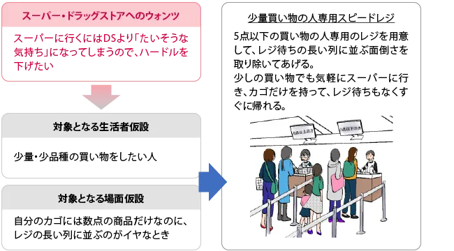 本調査で使用したスーパーの新サービスアイデアは、当社の定性データ分析&アイデア発想手法「解体親書」を用いて、普段から食品スーパー、ドラッグストアを利用している主婦自身が考えたサービスアイデアです。調査結果とともに、新サービスアイデアの発想プロセスについても紹介します。