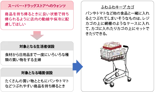ひとりひとりの購買行動を深く観察し、記録したデータをもとに、主婦がスーパーやドラッグストアに対してどのようなウォンツを持っているかを明らかにするための定性処理のワーク・分析※を行います。明らかになった主婦のウォンツから、新サービスアイデアを発想していきます。今回の調査では71件のスーパー・ドラッグストアにおける商品アイデアや販促アイデアが発想されました。その中から、3件のアイデアを下記に紹介します。
