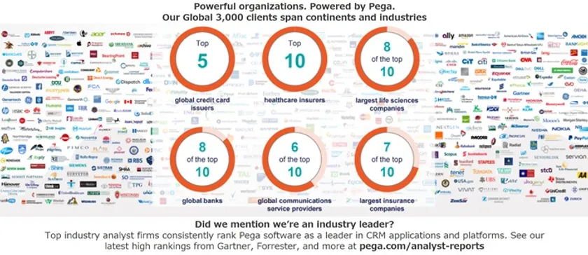 ペガシステムズはカスタマー エンゲージメントおよびオペレーショナル エクセレンスを実現するソフトウェアのリーダーです。ペガの適応型クラウド設計ソフトウェアでは、戦略的なビジネスニーズに合わせてアプリケーションを迅速に展開し、シンプルに変更することが可能です。過去35年にわたり、ペガはCRMとデジタルプロセスオートメーション (DPA) の分野で、人工知能とロボットオートメーションを搭載した受賞歴のある機能を提供しており、世界有数のブランドが画期的な業績を達成するのに貢献してきました。また、企業のデジタルトランスフォーメーションを強力に推進するプラットフォームを提供することで、グローバルトップ金融機関10行のうち8行に選ばれ、日本含む世界の金融機関100行以上に採用される実績を有しています。全ソリューションの基盤となるPega Platformを柱に、金融業界向けにMarketing、Sales Automation、KYC & Customer Lifecycle Management(CLM)、Customer Service、Collections、Smart Dispute/Investigateと、バリューチェーンの各領域における戦略的アプリケーションを提供します。尚、米国を中心に多数の大手金融機関とのリレーションおよび導入実績で培った豊富な知識と経験がアプリケーションに反映されているのは勿論のこと、他の多くのインダストリーでもグローバルトップ企業に選ばれている実績がございます。