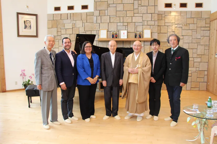 アメリカの大学教育やウィティア大学について広く知ってもらう目的で、大里研究所はリンダ・ウーブレ学長とスティーヴン・デルガド副学長の来日を機に座談会を2018年9月12日に開催。座談会には、理事長の林の友人である、元国連事務次長の明石康氏や、瑞龍寺の清田保南老師らが招待されました。