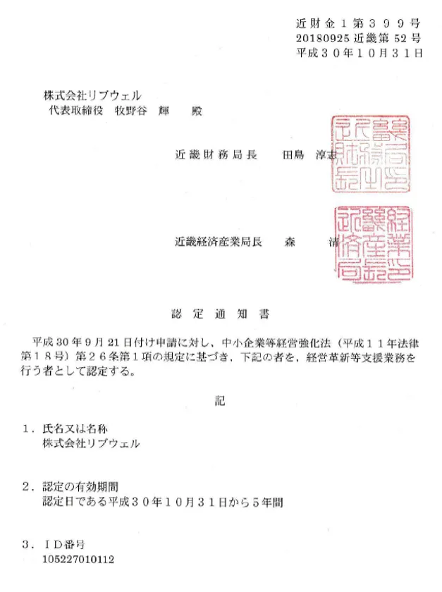 中小企業の経営支援を行う株式会社リブウェル(大阪市北区、代表取締役:牧野谷 輝)は、近畿財務局及び近畿経済産業局より、経営革新等支援機関認定制度における認定経営革新等支援機関(以下「認定支援機関」)に認定されました。