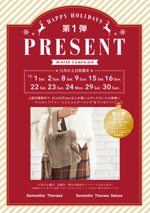 12月の土・日・祝日は、限定ドゥローブファーバッグを、総数1万名様にプレゼント。サマンサが贈る、限定ドゥローブファーバッグが手に入るチャンスは、11日間。