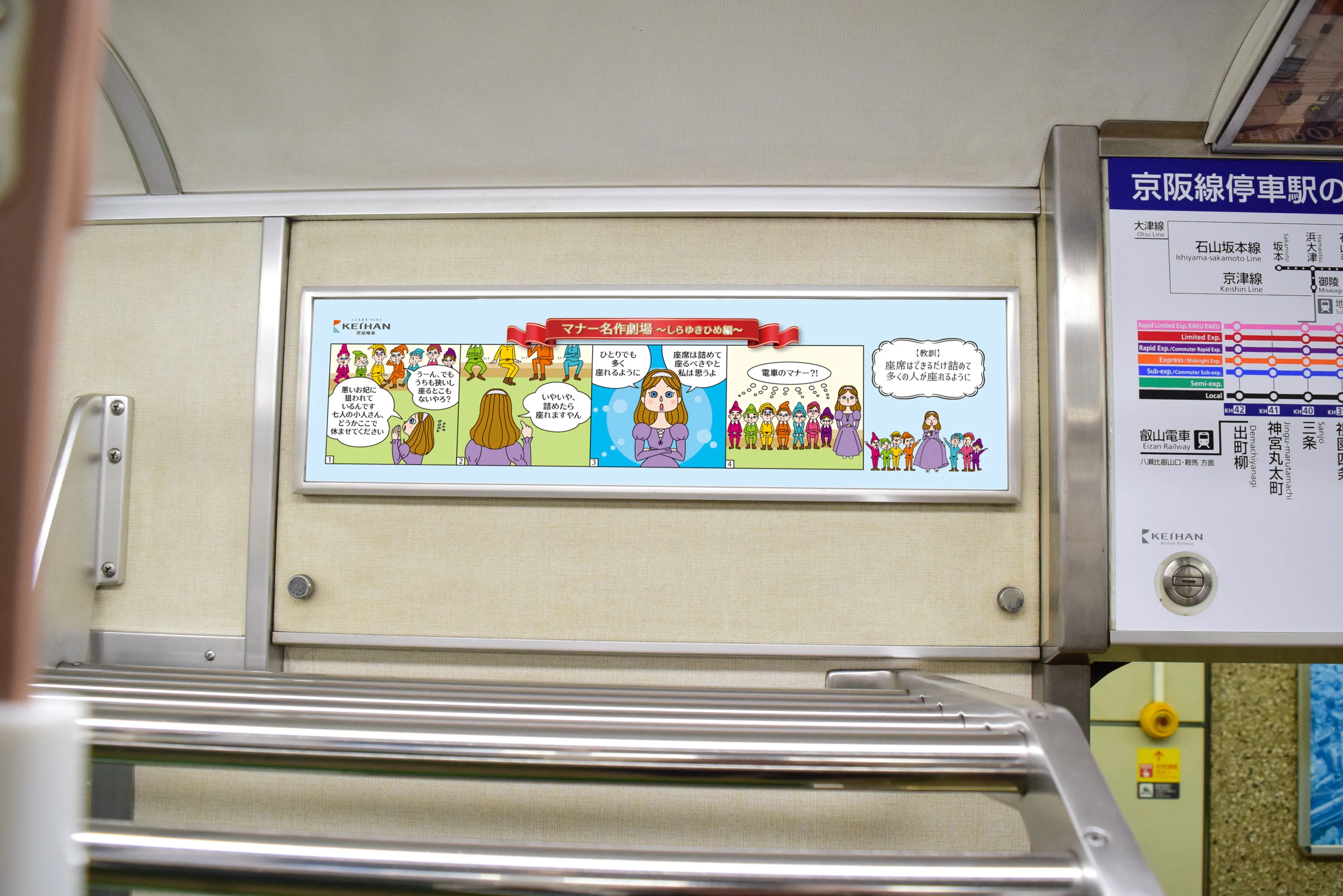 第3弾のポスターでは「座席の座り方」をテーマに、助けを求める白雪姫と、ベンチに座ったまま場所を譲らない7人の小人が登場し、思いやりのあるマナーとは何かを表現します。