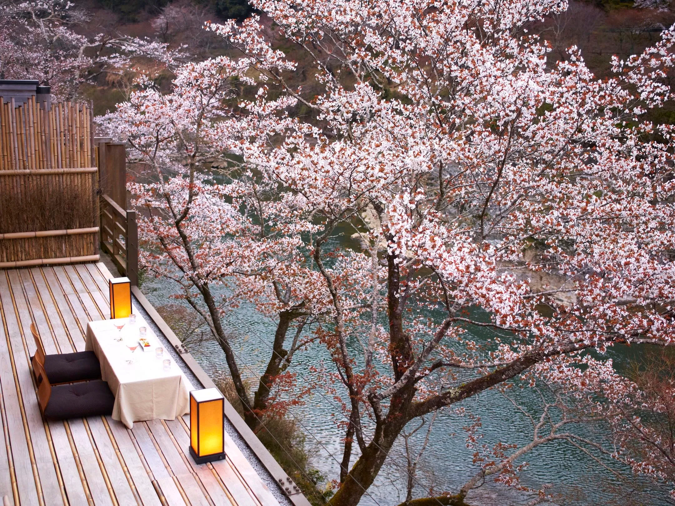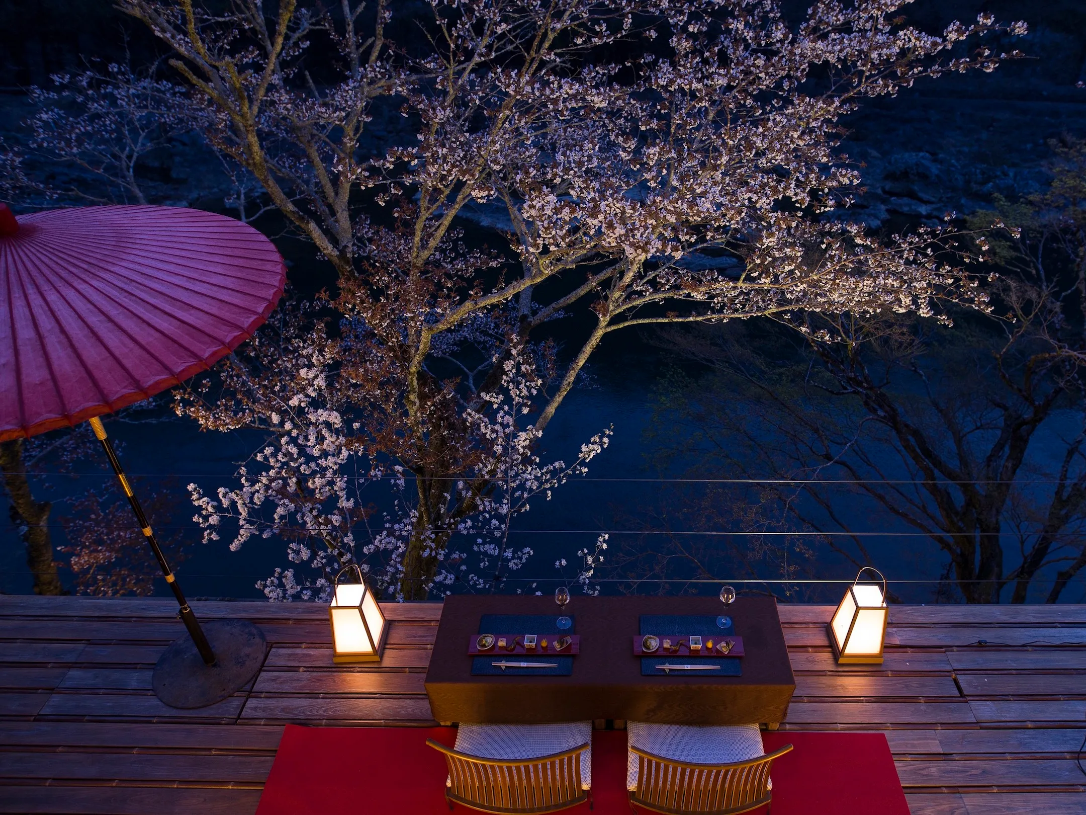 星のや京都施設内にある「空中茶室」に、 2019年3月25日~4月10日の期間中、1日1組のみの特別席を用意します。空中茶室は、星のや京都の前を流れる大堰川(おおいがわ)にせり出すように設えたテラスです。ここは、奥嵐山の景色を一望でき、間近に川の流れを感じられる空間です。春には手の届きそうな距離でヤマザクラを臨むことができ、夜になるとこのヤマザクラはライトアップされ浮かび上がって見えます。夜桜ディナーでは、川辺に吹く春風を感じながら、夜桜とともに会席料理とグラスシャンパンを楽しむことができます。