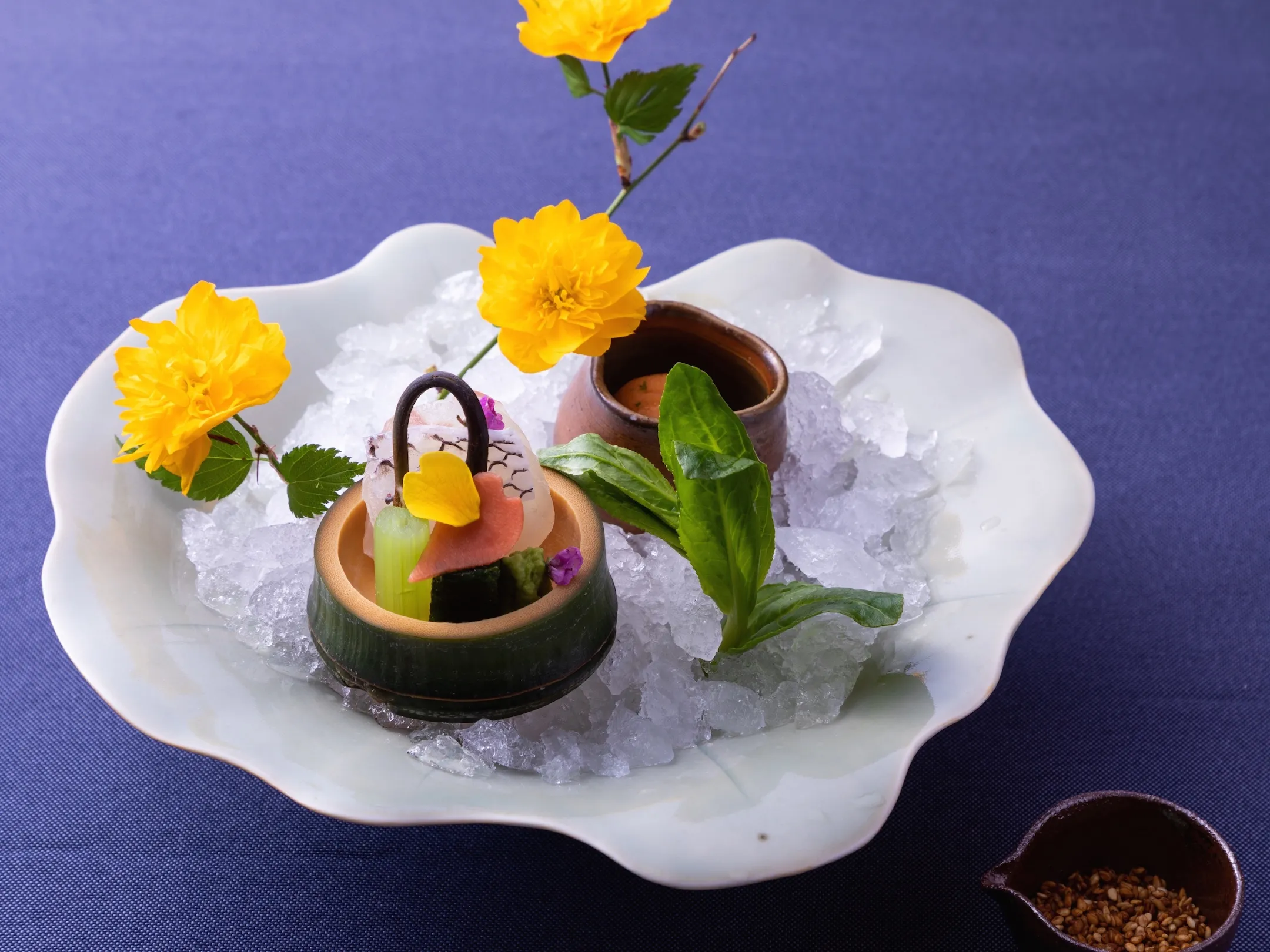 提供する会席料理は、「五味自在(ごみじざい)」と題し、日本料理の歴史や伝統文化を踏襲しながらも、その枠に捉われず食材や調理法を自在に取り合わせたものです。星のや京都は山々に囲まれ、四季の移ろいを感じられる場所にあります。この土地での滞在を楽しんで欲しいという思いから、五味自在では奥嵐山の季節を写した料理を提供します。春は、桜色や山吹色、若草色といった柔らかな彩りの食材や、春の芽吹きや苦味を味わうことができる旬の食材を使って、春爛漫(はるらんまん)を表現します。