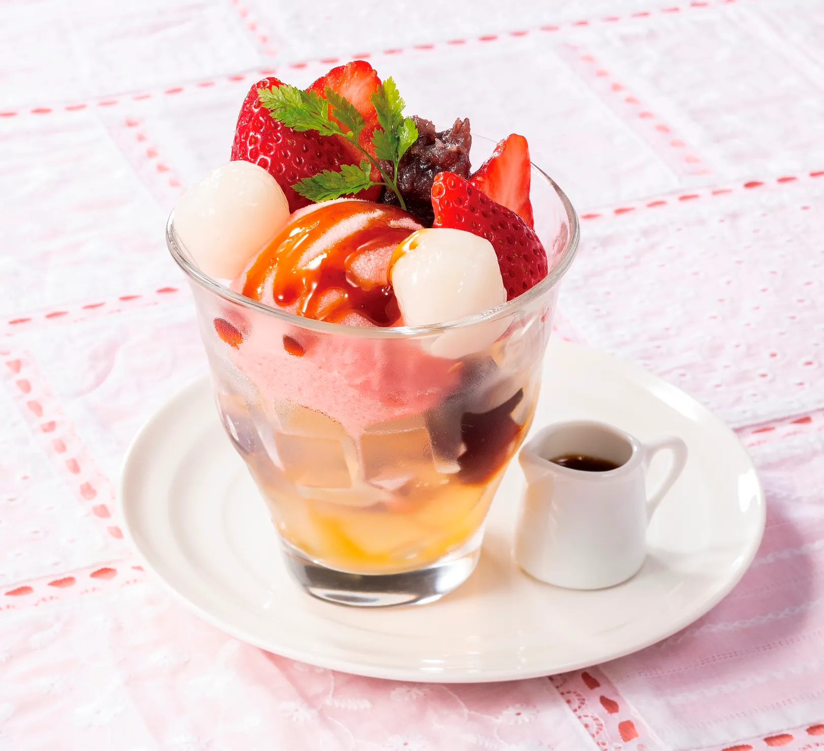 黒糖ゼリー、苺シャーベット、あずき、白玉、