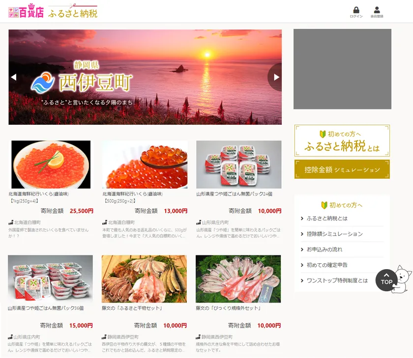 「サンプル百貨店」内の「ふるさと納税」特設ページ(イメージ)