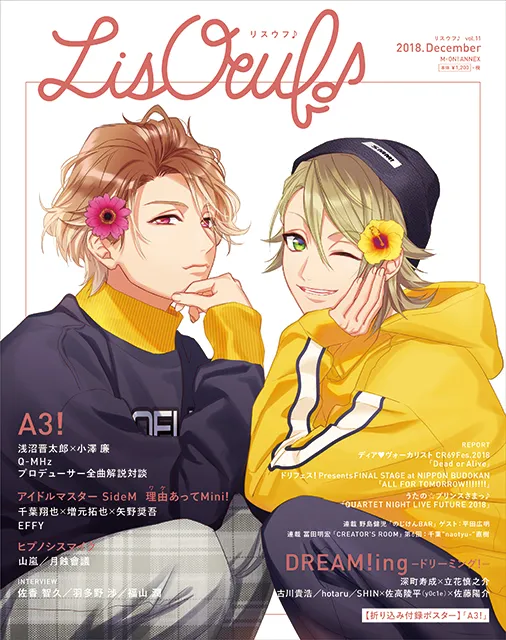 今号の表紙を飾るのは、巻頭特集の「A3!」より、春組・茅ヶ崎 至と夏組・三好一成のふたり。「LiOeuf♪」の表紙では恒例となっている“花”のモチーフについては、ふたりの髪飾りで使用されている。