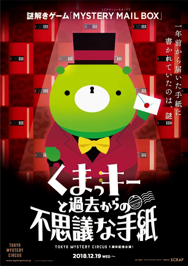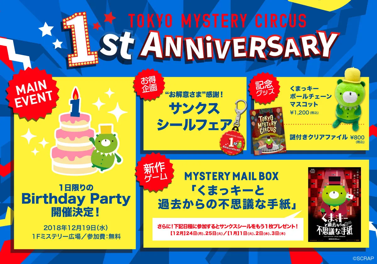 メインイベントは東京ミステリーサーカスが誕生した12月19日(水)に開催されるBirthday Party!1Fミステリー広場にて参加無料で、さまざまなイベントを1日通して実施します。その他にも、公演参加やグッズ購入でシールを集めて豪華賞品がGETできる「”お解意さま(おとくいさま)”感謝!サンクスシールフェア」、1周年を記念して団長くまっキーが制作したMYSTERY MAIL BOX最新作「くまっキーと過去からの不思議な手紙」の開催も決定。また、記念グッズとして、ぬいぐるみタイプのキーホルダー「くまっキーボールチェーンマスコット」と「謎付きクリアファイル」を販売いたします。さらに、12月19日(水)には公式アプリ限定の超お得なクーポンの配信も予定しております。