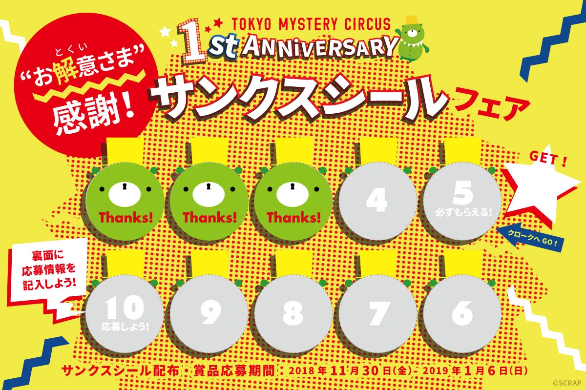 日頃から謎解きやお買い物を楽しんでいただいている”お解意さま”に感謝の気持ちを込めて、公演参加やグッズ購入などで「サンクスシール」をためると、東京ミステリーサーカスにちなんだ豪華賞品がGETできちゃう嬉しいフェアを開催いたします。