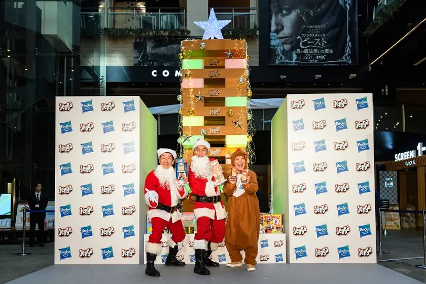 そして、高さ約4mの巨大ジェンガクリスマスツリーに驚きながらも、例の<ジャンプ芸>を繰り返し、ジェンガツリーが崩れてしまう!?とヒヤヒヤする場面も。点灯セレモニーには、ハズブロジャパンのカントリーマネージャーが約1mのジェンガの木製ブロックを持って登場。