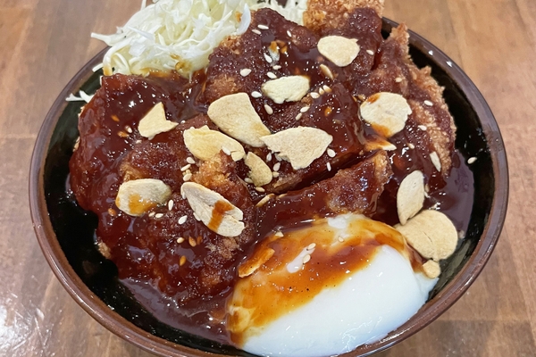 ご飯の上にはこんもりとキャベツとサックサクのカツを乗せます。全体に、たっぷりのにんにく香る甘辛い特製タレとにんにくチップをかけました。にんにくの香りが食欲をそそり、甘辛い特製タレがご飯やカツともよく合います。さらに、温玉を絡ませれば濃厚感がアップしてよりご飯がすすみます。