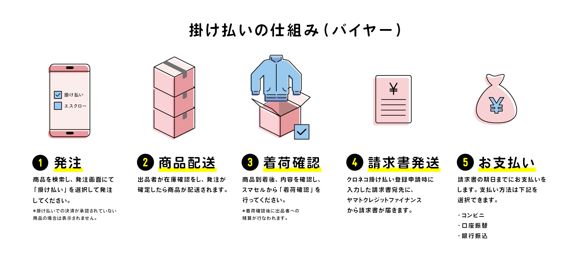 特価商品/在庫商品の業界においては前払いが通例ですが、「クロネコ掛け払い」を導入することでSMASELL(スマセル)で掛け払いが無料で使えるようになり、より広いユーザー様に安心して売買頂ける様になりました。