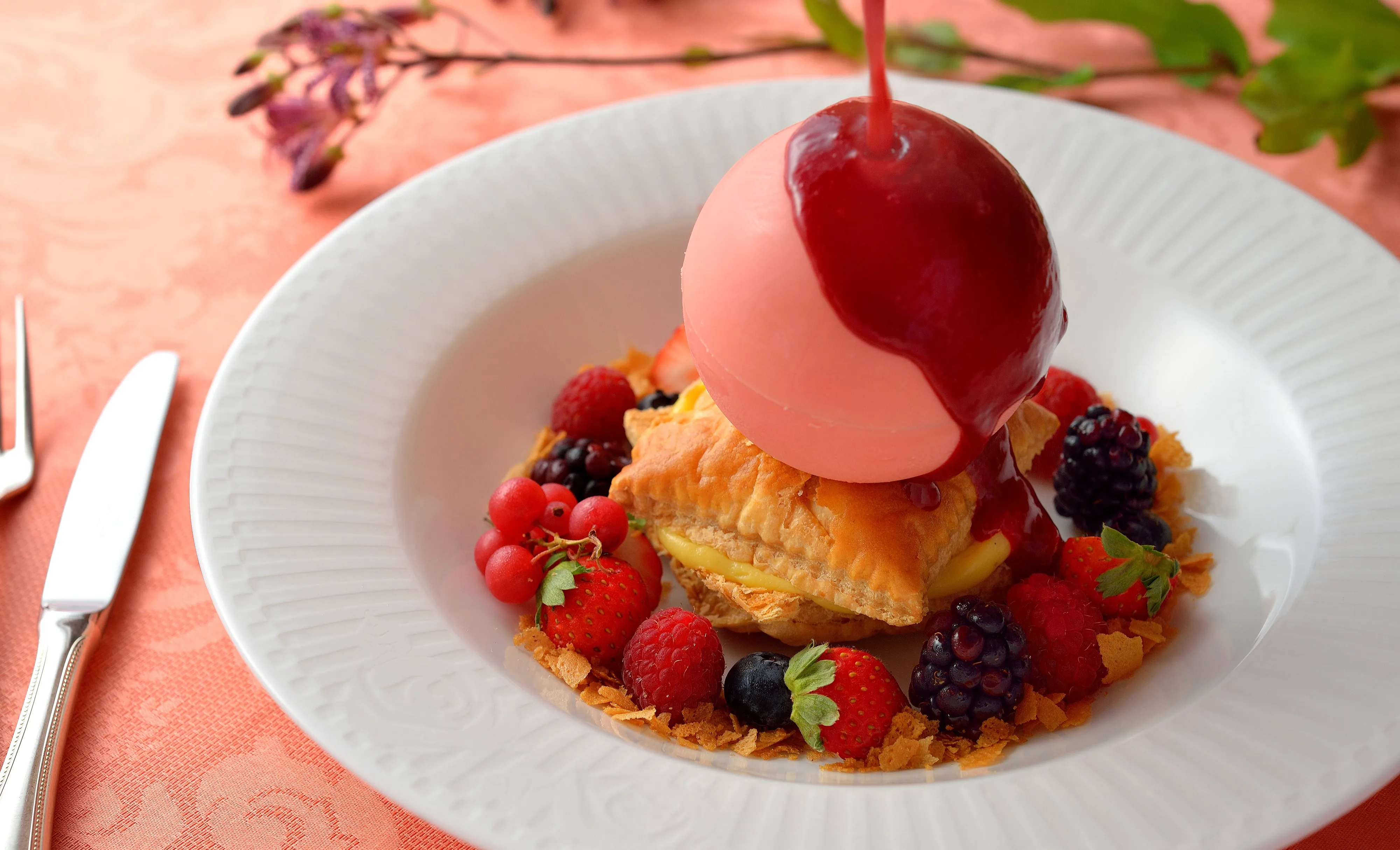 「カレボー(R)ルビーチョコレートRB1」のフルーティーな酸味を活かし、苺やベリーと組み合わせました。ピンク色の球体チョコレートに温かい苺ソースをかけると、中からベリーの果肉をのせた苺ムースが登場。球体の下のカスタードを挟んだパイ、フレークやフランボワーズ、ベリーと絡めてお召しあがりください。