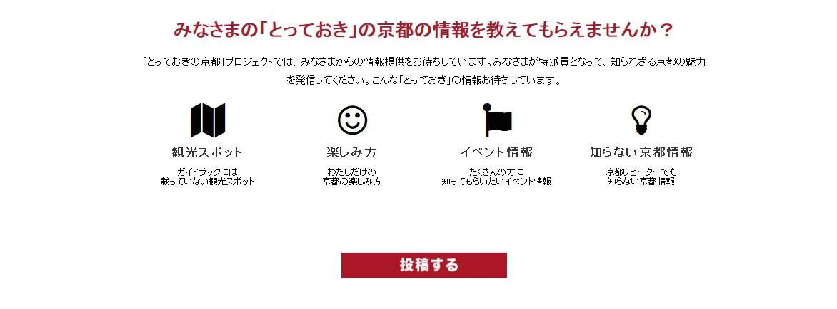 この度,とっておきの京都プロジェクト公式ウェブサイトを開設し,地元住民や事業者の皆様,そして観光客の皆様がそれぞれの「とっておきの京都」を投稿・共有できるコンテンツを中核として,各エリアの魅力や観光情報,地域のイベントなどを情報発信していきます。