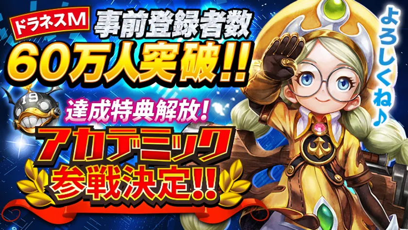 Eyedentity Games Japan株式会社は、3DアクションRPG『ドラゴンネストM』の事前登録者数が60万人を突破したことをお知らせします。事前登録キャンペーン内にて告知しておりました通り、60万人達成特典の新キャラ解放として「アカデミック」がリリース時に参戦いたします。