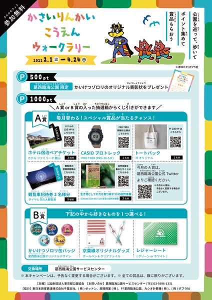 人気キャラクター「かいけつゾロリ」が葛西臨海公園をクイズ形式で紹介する子ども向けコンテンツ。公園の指定スポットを巡ったり、公園の周辺施設等を歩いてポイントを集めるとサービスセンターで賞品がもらえる他、毎月賞品が変わる!抽選キャンペーンも実施!