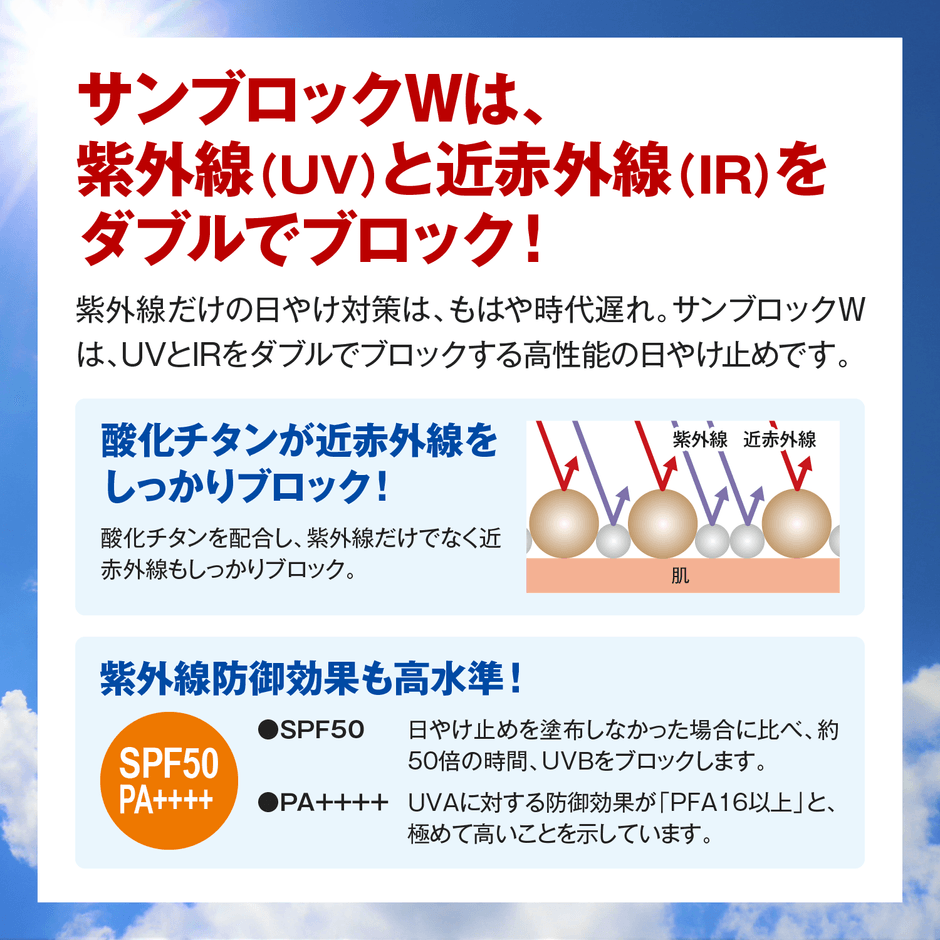 今年の夏はサンブロックWで、紫外線と近赤外線からお肌を守り、白くて美しいお肌をキープしましょう!
