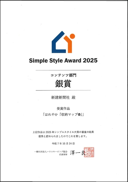 新建新聞社(東京都千代田区・長野県長野市)は、特定非営利活動法人 ハウスキーピング協会が主催する「シンプルスタイル大賞2025」において、書籍『はれやか「収納マップ®」』コンテンツ部門の銀賞を受賞。2025年10月24日(金)に東京都墨田区のKFC Hall & Roomsで開催された「整理収納フェスティバル」にて表彰式が行なわれました。