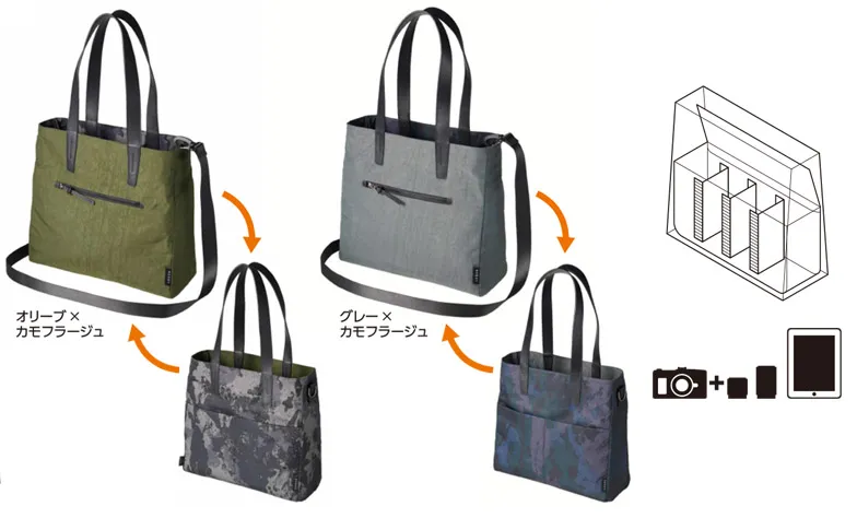 一見するとカメラバッグに見えないスクエアでシンプルなトートバッグスタイルで、様々なシーンでお使いいただけます。