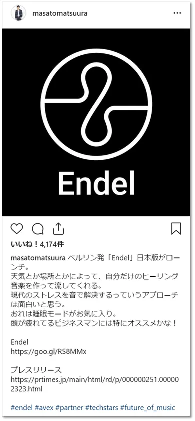 エイベックス株式会社は、海外スタートアップとのオープンイノベーションの一環として、今年8月末付けでEndelへの出資を行いました。Endelのローカルマーケティングパートナーとして、アプリの流通やプロモーションの他、様々な企業とのアライアンス推進などの戦略的コラボレーションを行い、Endelの日本における事業拡大をサポートしていく予定です。