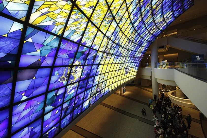 パシフィコ横浜 国立大ホールのエントランスを飾るステンドグラス「星座’94横浜」は幅13~19m、高さ14mの大きさを誇り、宇宙の無限の広がり、奥行きを観るものに感じさせます。