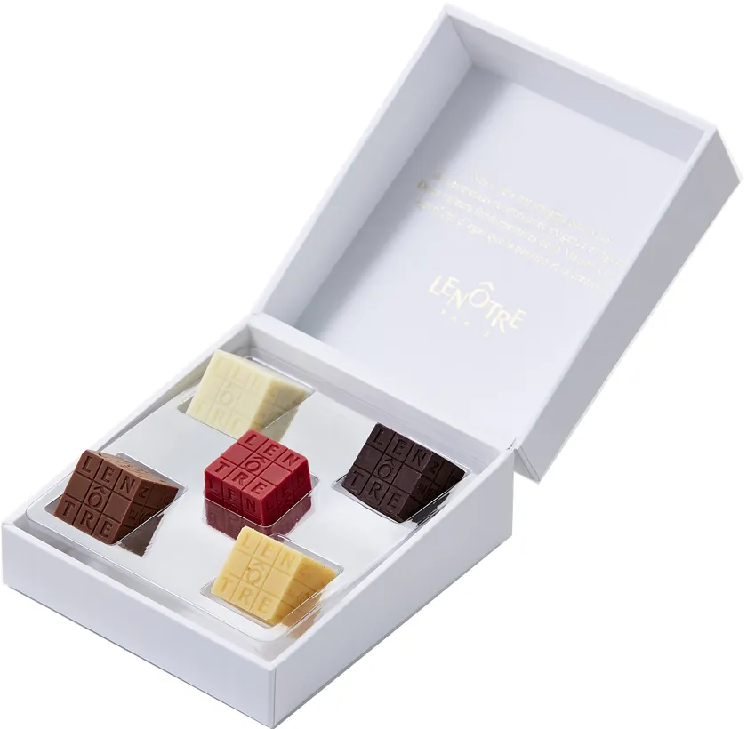 伝統的なアーモンドプラリネにココナッツという新しい価値を加えた<ココ>、爽やかな苺のピューレをとじ込めた<フレイズ>、深みのあるダークチョコレートガナッシュを愉しめる<パッシー>、心地よい酸味のパッションフルーツが際立つ滑らかなホワイトショコラのガナッシュ<パッション>、伝統的なアーモンドプラリネを愉しむ<エリゼ>。ルノートルのロゴを5面に刻印した代表的なフォルムと、華やかな色合いが融合した、ルノートルらしさ溢れる新しい5種類のキューブ型のショコラをお愉しみください。