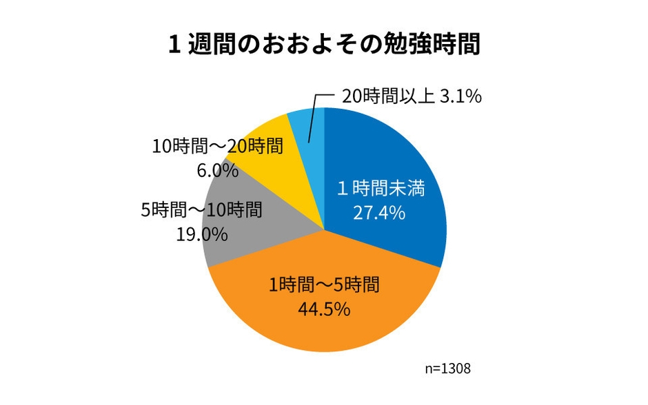 「1時間未満(27.4%)」「1時間~5時間(44.5%)」「5時間~10時間(19.0%)」「10時間~20時間(6.0%)」「20時間以上(3.1%)」