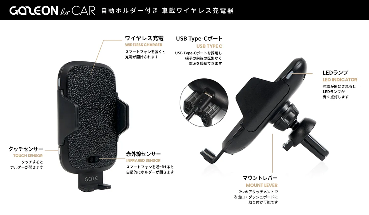 GAZEからセンサーで自動ロック、おしゃれなワイヤレス充電付き車載ホルダー発売