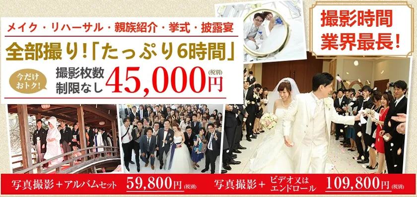 一般的な結婚式会場で料金※は、写真撮影15万円~、ビデオ撮影15万円~、エンドロール撮影20万円~全部で約50万円と高額であり、結婚式費用全体の多くの割合を占めるものとなっており、新郎新婦の大きな悩みとなっています。