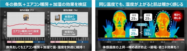 また、サーモグラフィによる可視化検証では、同じ温度でも湿度が高い方が、より暖かく感じることが分かりました。加湿して体感温度を上げることで、エアコンの設定温度を控え目にすることもできるので、省エネ効果も期待できます。
