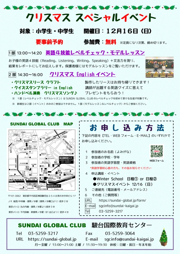 帰国生入試や英語学習者の支援・受験対策講座を展開し、高い実績を有する駿台予備学校グループ・駿台国際教育センター(所在地:東京都千代田区)が、英語学習に取り組むお子様や帰国生を対象に、無料クリスマスイベントを2018年12月16日(日)に東京・お茶の水で開催します。