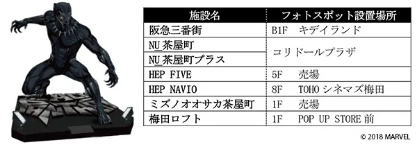 阪急梅田駅周辺エリアにマーベルキャラクターのフォトスポットが登場。アイアンマンやブラックパンサー、スパイダーマンなどいろいろなマーベルキャラクターの迫力ある等身大フィギュアが出現。どれもこれもインスタ映えすること間違いなし。