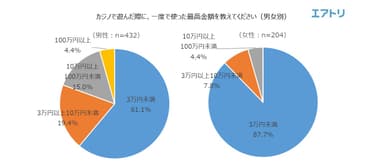 「3万円未満」と69.7%の人が回答しました。男女別では、「3万円未満」(男性:61.1% 女性:87.7%)、「3万円以上10万円未満」(男性:19.4% 女性:7.8%)、「10万円以上100万円未満」(男性:15.0% 女性:4.4%)、「100万円以上」(男性4.4% 女性:0%)と、男性の方が女性より使用金額が高いことがわかりました