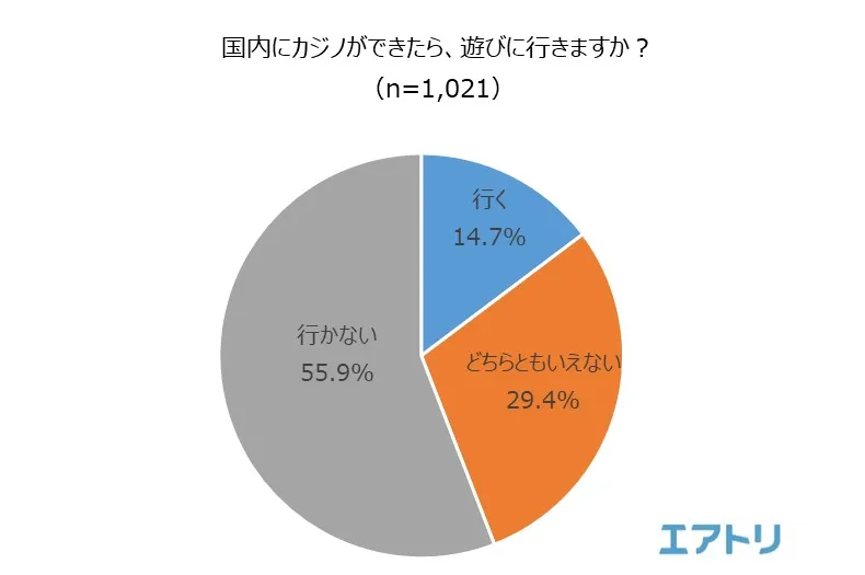「遊びに行く」(14.7%)「遊びに行かない」(55.9%)と、国内にカジノができても半数以上の人が“遊びに行かない”と回答しました。