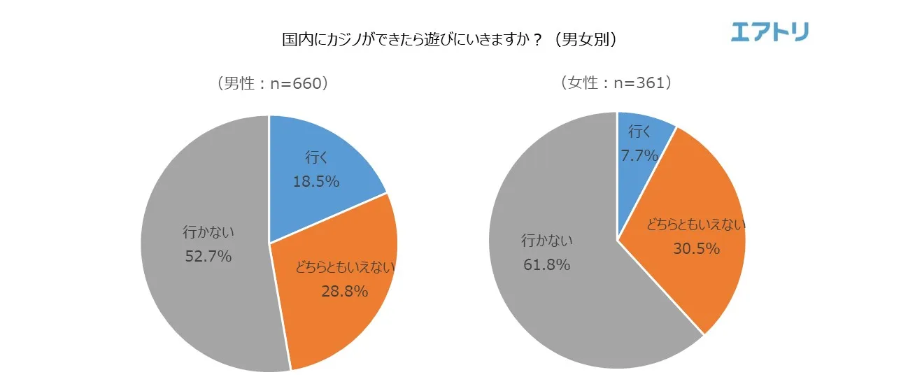 「遊びに行く」14.7%「行かない」55.9%と、国内にカジノができても“遊びに行かない”と半数以上の人が回答しました。また、男女別で見ると、「遊びに行く」(男性:18.5% 女性:7.7%)と、男性が女性より利用意向が高いことが分かりました。ゲーム文化が成熟している日本ならではのアミューズメント性に期待が持たれる一方、「カジノは海外で楽しむもの」、「日本にカジノができたとしてもあくまでインバウンド向け」という回答も多く寄せられました。