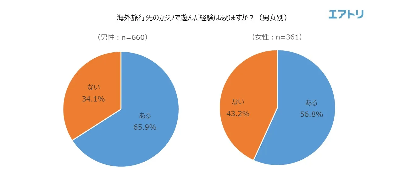 「遊んだことがある」(62.7%)と、6割以上の人が海外旅行先でカジノに行った経験があると回答しました。男女別では、「遊んだことがある」(男性:65.9% 女性:56.8%)と、男性が女性より利用経験が高いことが分かりました。
