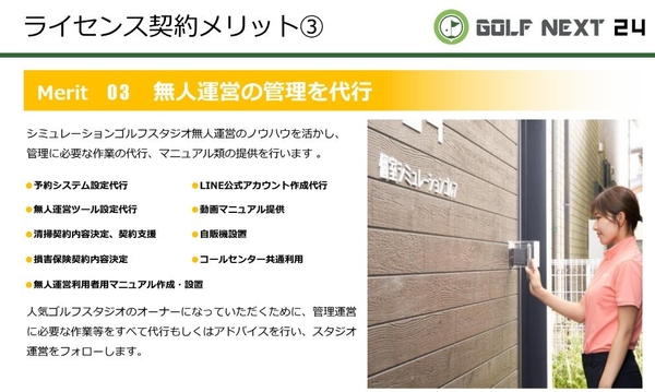 不動産の所有、売買、管理などを行うワイム総合企画株式会社(東京都新宿区、代表取締役 佐藤 直史)は、昨年12月に完全個室型・無人24時間運営のインドアゴルフ事業【GOLF NEXT 24】をスタートし7月には5店舗目をオープンする予定です。そのノウハウを活かし無人運営のインドアゴルフ事業の開業・運営するにあたり必要となる店舗の土地探しから施工・内装・システム設備・運営ノウハウに至るまで、ありとあらゆる事業サポートの提供を開始いたします。