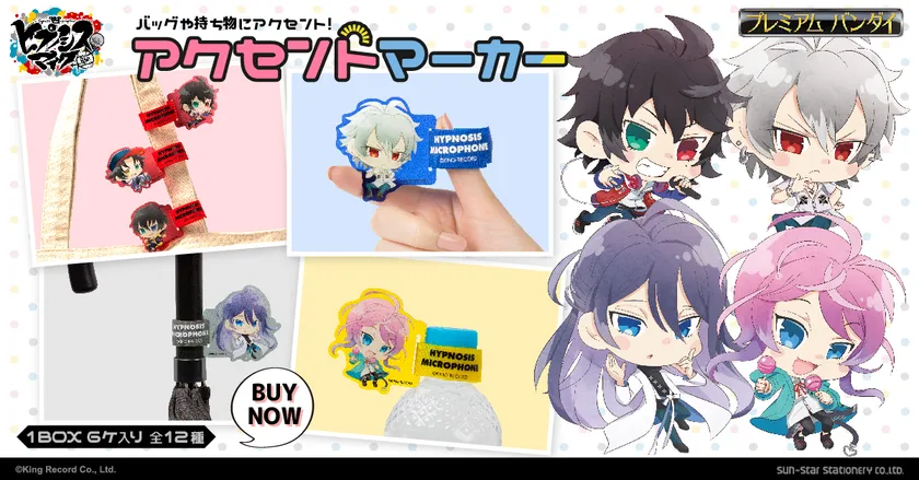 サンスター文具株式会社(本社:東京都台東区、代表取締役社長:小林 大地)では、男性声優キャラ12人による音楽原作キャラクターラッププロジェクト「ヒプノシスマイク -Division Rap Battle-」より、「マイ傘」の目印やバッグの持ち手に取り付けるなど様々な用途で使える『アクセントマーカー(6個入りBOX 全2種)』(全2種、各4,212円 税込/送料・手数料別途)と、各ディビジョンのイメージカラーをベースに“煽り文”をあしらった『ロングスティックキーホルダー』(全12種、各2,808円 税込/送料・手数料別途)の予約受付をバンダイ公式ショッピングサイト「プレミアムバンダイ」( http://p-bandai.jp/?rt=pr )内のショップ「サンスターステーショナリーストア」にて2018年12月7日(金)13時に開始いたします。(発売元:サンスター文具株式会社)