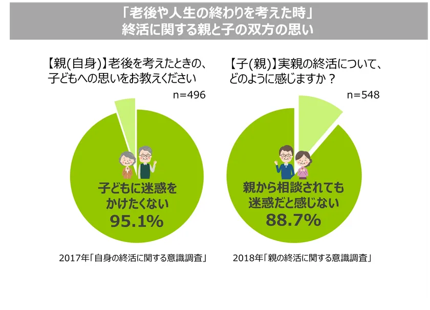 今回、2017年12月に発表した「自身の終活に関する意識調査」と、2018年11月に発表した「親の終活に関する意識調査」の結果を比較したところ、「自身の終活」と「親の終活」では意識に大きな差があることがわかりました。
