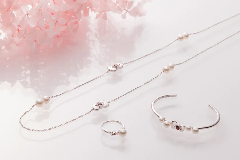ステーションペンダント、リング、バングルのすべての各アイテムに赤い宝石の輝くリボンをあしらって、リボンという大人可愛いモチーフでありながら、赤いガーネットと本物のパールで、エレガントで洗練されたデザインに仕上がっています。