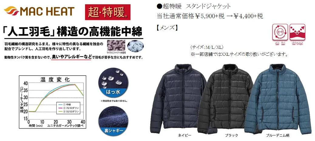 メンズのおすすめは、マックヒートアウターの『超・特暖アウター』。マックヒートアウターは機能中綿(人工羽毛)素材を使用し、驚きの暖かさを実現しました。羽毛に比べて吹き出しが少なく、保温性やボリューム感を兼ね備えています。動物性タンパク質を含まないので「ニオイやアレルギー」などで、羽毛が苦手な方にもおすすめです。また、『超・特暖アウター』の裏地には毛足の長いフリース素材を使用しており、肌触りなめらかで、温もりを逃しません。ウィメンズは、サテンの上品な光沢感が美しい『サテンロングコート』がおすすめ。ロング丈で大人っぽく綺麗めに着れます。キッズは、マックヒートアウターのフードジャケットがおすすめです。雨や汚れに強いはっ水加工の素材なので、安心して外で遊べます。