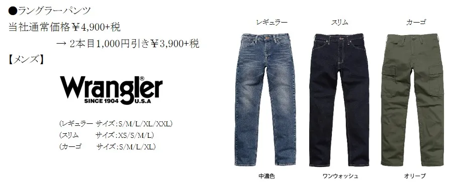 また、アメリカの3大デニムブランドのひとつ「Wrangler(R)(ラングラー)」より、当社限定のNew Wranglerを発売。