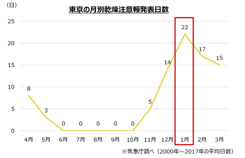 気象庁が発表している東京の月別乾燥注意報によると、2000年から2017年の過去7年間の平均日数で最も多いのが1月で22回ということが分かりました。空気が乾燥すると、口や鼻などの呼吸器系の粘膜が乾燥し、免疫力が低下するため、風邪などのウィルスが体内に入りやすくなります。また、健康面だけではなく、肌など美容面にも大きく影響します。肌荒れやかゆみは乾燥が原因の1つです。肌の最も表面に存在する角層には、健康であれば20-30%の水分が含まれており、水分量がそれより少ない状態を乾燥肌といいます。部屋の暖房もまた乾燥肌を促進させる要因の1つと言えるでしょう。