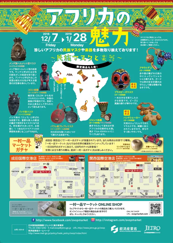 株式会社JTBコミュニケーションデザインは、アジア・アフリカ等の開発途上国の産品を紹介するアンテナショップ「一村一品マーケット」で、TICAD VII開催決定を記念し、アフリカの文化を楽しく体感出来る商品を集めた「アフリカの魅力~民族マスクと楽器~」を、2018年12月7日(金)~2019年1月28日(月)の期間限定で開催いたします。