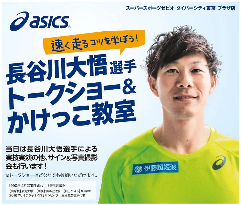 物理療法機器のパイオニア、伊藤超短波株式会社(本店:東京都文京区、代表取締役社長:倉橋 司、以下 伊藤超短波)所属の陸上男子三段跳び 長谷川大悟選手が12/15(土)にスーパースポーツゼビオ ダイバーシティ東京 プラザ店で開催される「トークショー&かけっこ教室 <速く走るコツを学ぼう!>」にゲスト出演いたしますのでお知らせいたします。